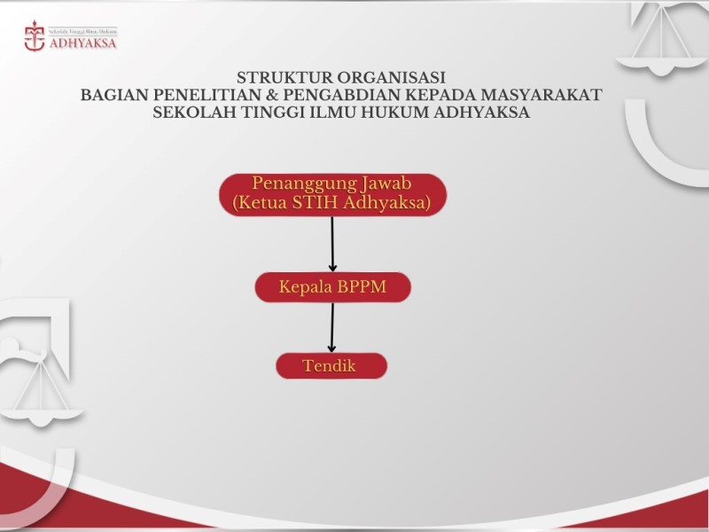 Bagian Penelitian dan Pengabdian kepada Masyarakat (BPPM) di STIH Adhyaksa berfungsi sebagai wadah resmi untuk melaksanakan kegiatan penelitian dan pengabdian kepada masyarakat. BPPM memiliki tanggung jawab untuk mengoordinasikan dua dari tiga pilar Tridharma Perguruan Tinggi, yaitu penelitian dan pengabdian kepada masyarakat.
