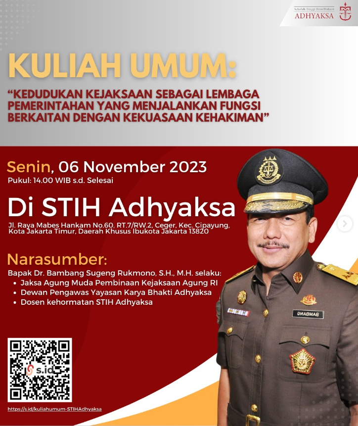 Hari ini, STIH Adhyaksa menyelenggarakan kegiatan kuliah umum yang bertemakan “Kedudukan Kejaksaan Sebagai Lembaga Pemerintahan Yang Menjalankan Fungsi Berkaitan Dengan Kekuasaan Kehakiman” dengan menghadirkan praktisi yang luar biasa sebagai narasumbernya, yaitu Bapak Dr. Bambang Sugeng Rukmono, S.H., M.H. selaku Jaksa…