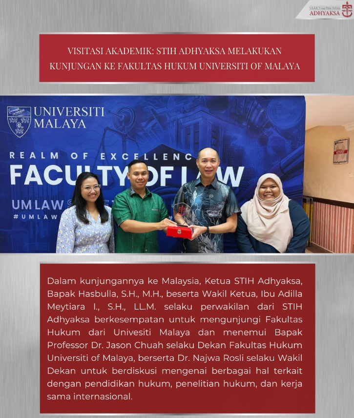 Dalam kunjungannya ke Malaysia, Ketua STIH Adhyaksa, Bapak Hasbullah, S.H., M.H., beserta Wakil Ketua, Ibu Adilla Meytiara I., S.H., LL.M. selaku perwakilan dari STIH Adhyaksa berkesempatan untuk mengunjungi Fakultas Hukum dari Univesiti Malaya dan menemui Bapak Professor Dr. Jason Chuah…