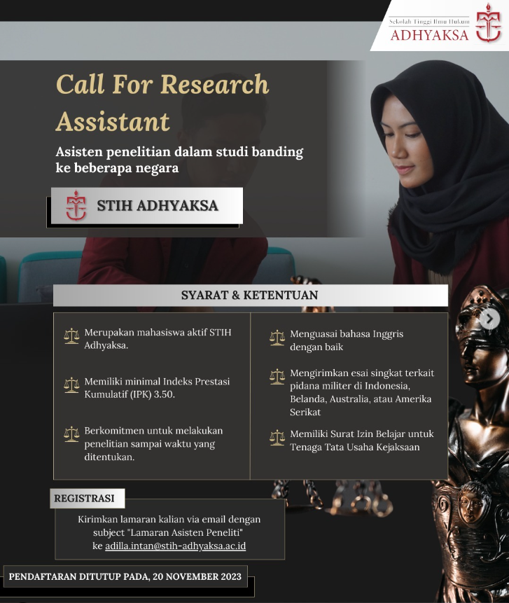 Pemberitahuan: Mahasiswa STIH Adhyaksa! Apakah kalian tertarik untuk terlibat dalam penelitian studi banding hukum diluar negeri? STIH Adhyaksa membuka kesempatan untuk bergabung sebagai Asisten Peneliti dalam sebuah penelitian berskala internasional! Persiapkan dirimu dan pastikan telah memenuhi syarat-syarat berikut ini:• Mahasiswa…