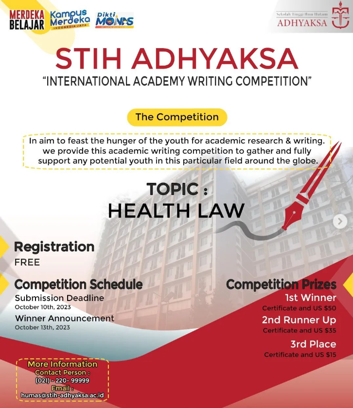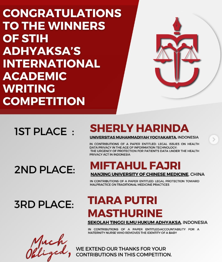 Selamat yang sebesar-besarnya untuk para pemenang STIH Adhyaksa International Academic Writing Competition! Prestasi kalian dalam ajang ini sungguh menginspirasi, semoga hal ini dapat menjadi langkah pendorong dalam menuju kesuksesan yang lebih besar lagi. ________________________________________________________________________ Big congratulations to the winners of…
