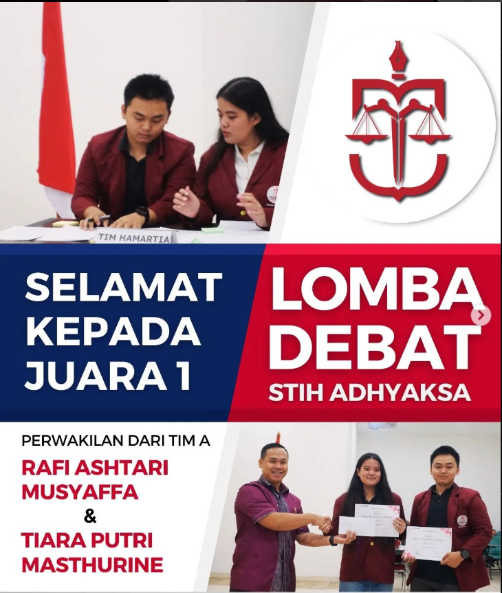Selamat kepada para juara lomba debat STIH Adhyaksa Juara 1: Tim A (Rafi Ashtari Musyaffa & Tiara Putri Mashturine)Juara 2: Tim B2 (Rifi Khusnan Muaward & Agung Hidayatullah)Juara 3: Tim B1 (Agung Muhammad & Bintang Jambi Putra) Kami ucapkan terima…
