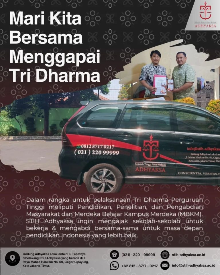Menjajaki terkait kerja sama Tridharma Perguruan Tinggi antara STIH Adhyaksa dengan Hukum Online. STIH Adhyaksa menyambut kedatangan HukumOnline.com di Gedung Adhyaksa Loka lantai III, Jl. Raya Mabes Hankam No. 60, Ceger, Cipayung, Kota Adm. Jakarta Timur. Disampaikan, salah satu bentuk…